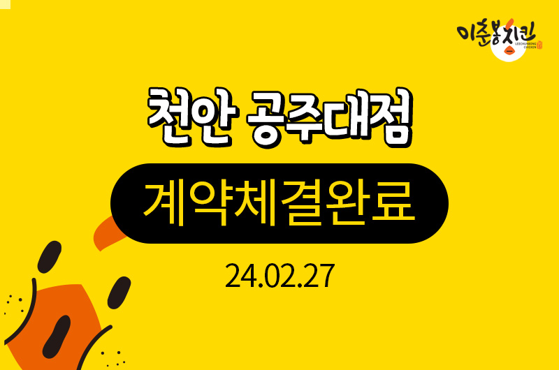 이춘봉치킨천안 공주대점 계약체결완료 [계약일] 2024.02.27 [매장(예정)주소]충청남도 천안..